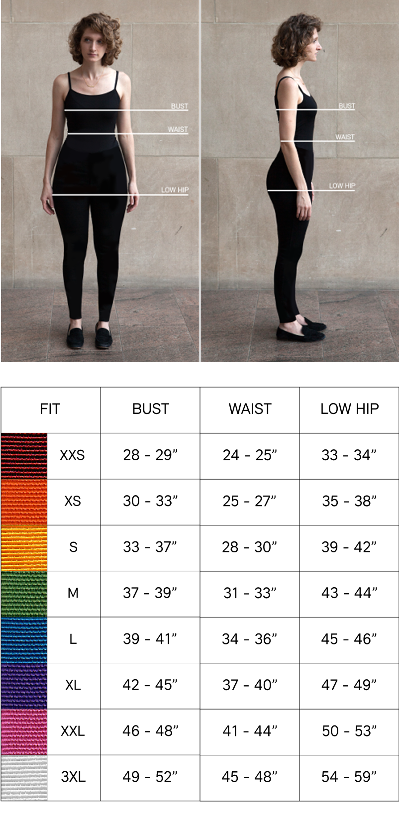 Dee, pictured here, is 5'4" and has a 36" bust, 26" waist, and 36" hip and wears a size S. With those measurements, she could also fit comfortably in an XS.