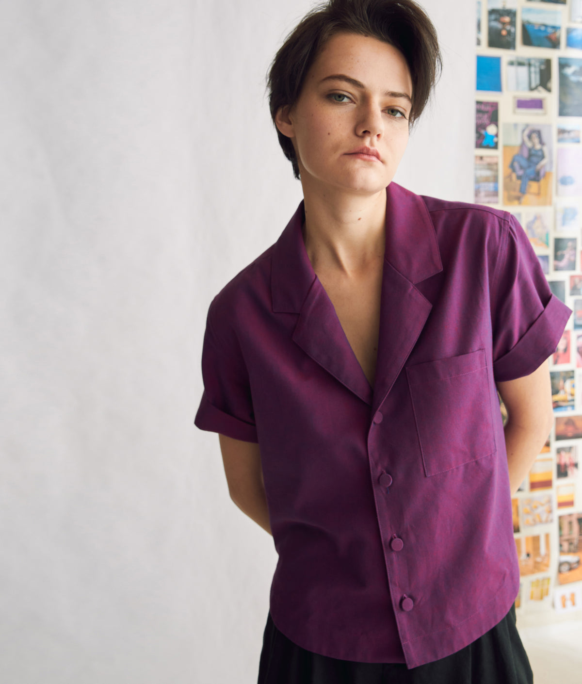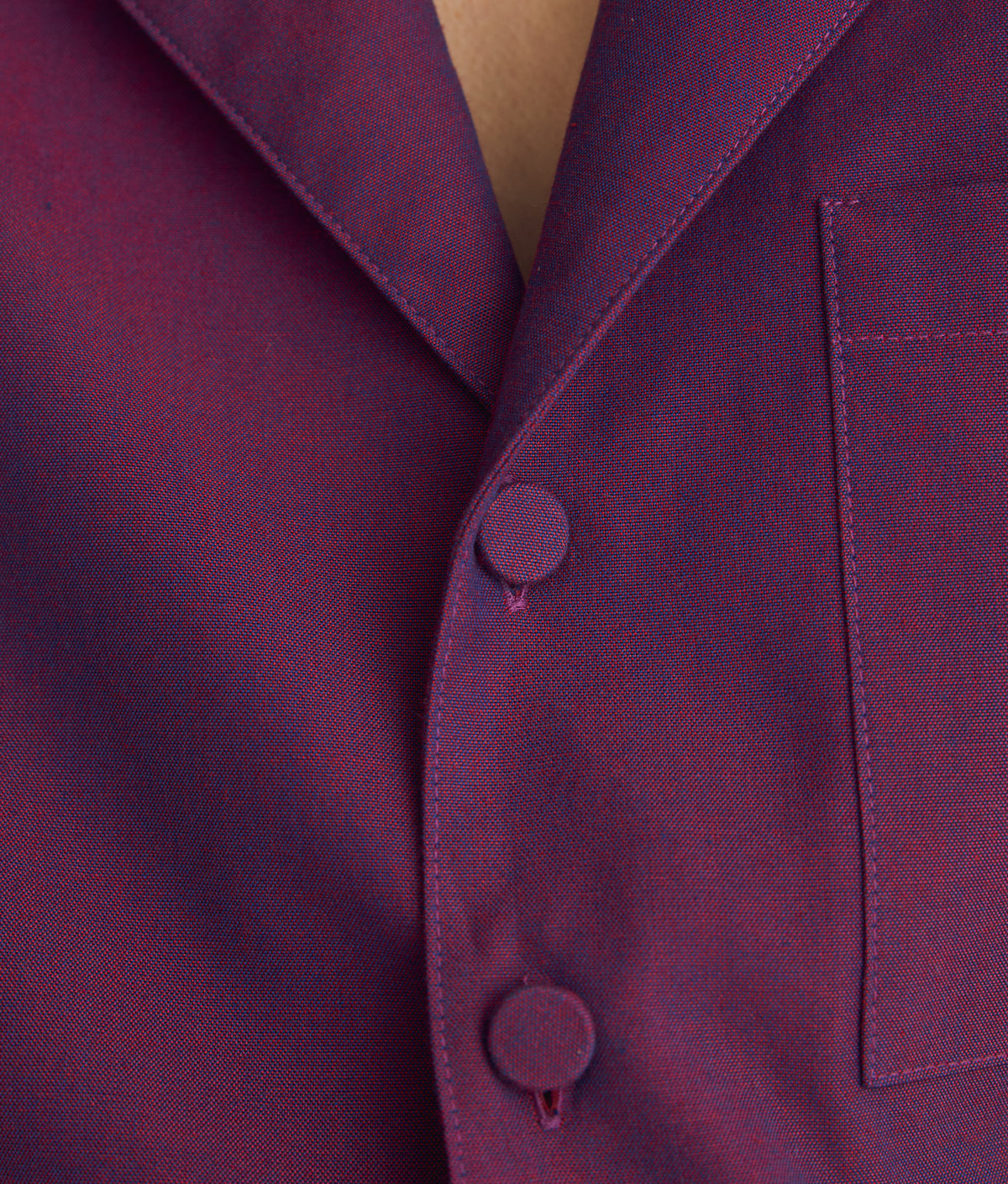 Made in 100% cotton, dyed, and woven in India, finished with fabric-covered buttons sourced from our good friends in New York's Garment District. With blue thread on the warp and red on the weft, the purple hue is actually a striking illusion, giving the shirt an alluring wavelike visual texture.