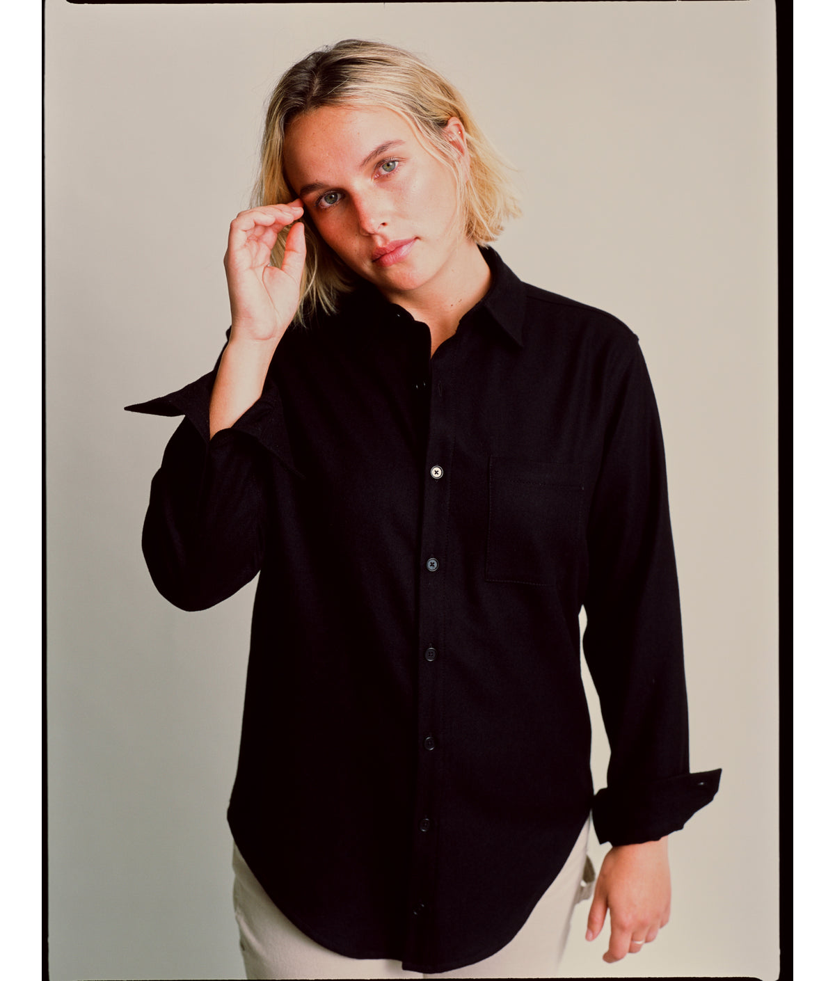 A true workshirt: tough and durable, but damn it's soft and elegant. 100% merino wool with dyed corozo buttons.