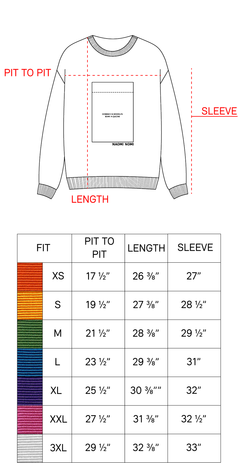 Because these are made from upcycled vintage, there are slight measurement variations across sweatshirts of the same size, but we are confident in the specs of this guide. Still unsure about your fit? Email studio@naominomi.com and we’ll be happy to help.