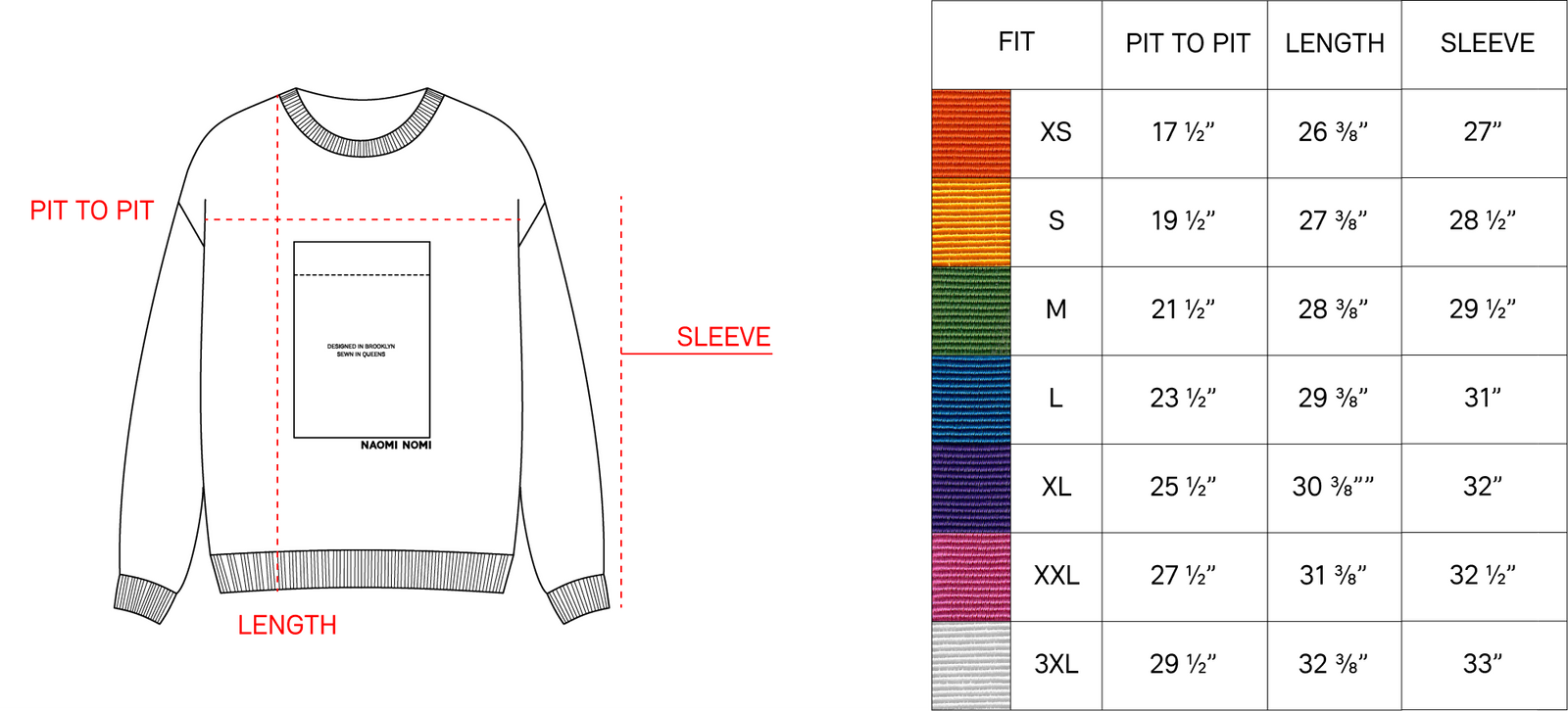 Notes on our sizing: In April 2022, we implemented a new Fit Guide! This included both tweaks to our existing sizes, and an expanded size range of 3XL. If you've purchased from us in the past, please review the updated Guide above as some things have changed! Questions? Get in touch at studio@naominomi.com